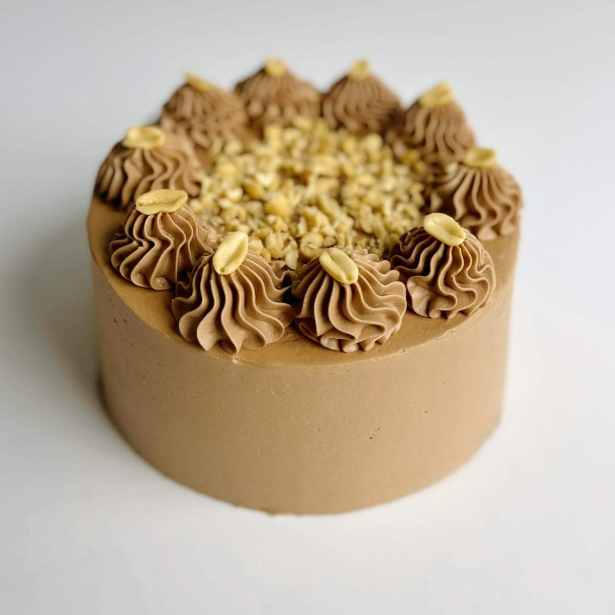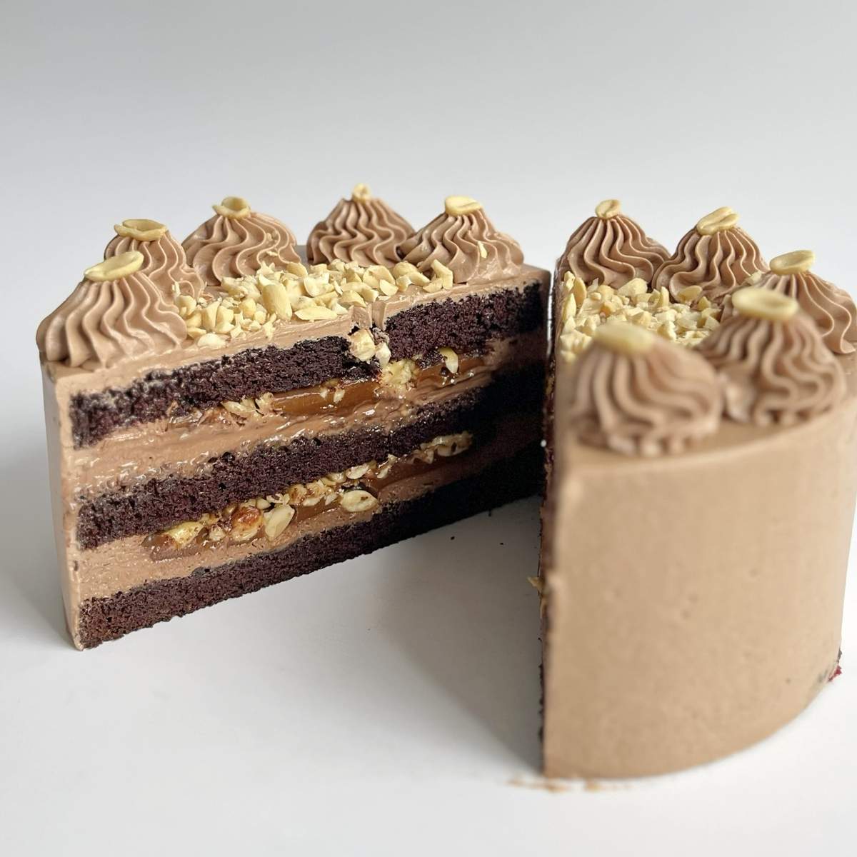 Brownie čokoládový korpus, smetanový krém s arašídovým máslem, domácí slaný karamel s praženými arašídy