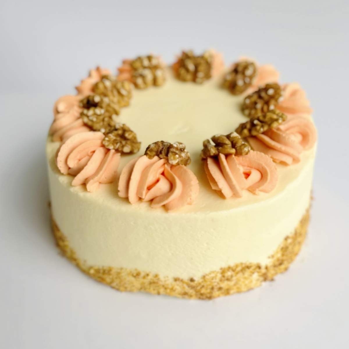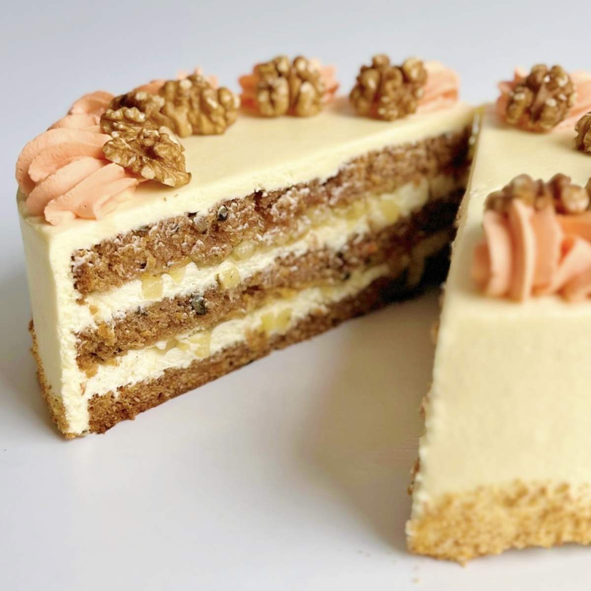 Vlhký mrkvový korpus s karamelizovaným vlašským ořechem, krémem ze zakysané smetany a hruškovým konfit